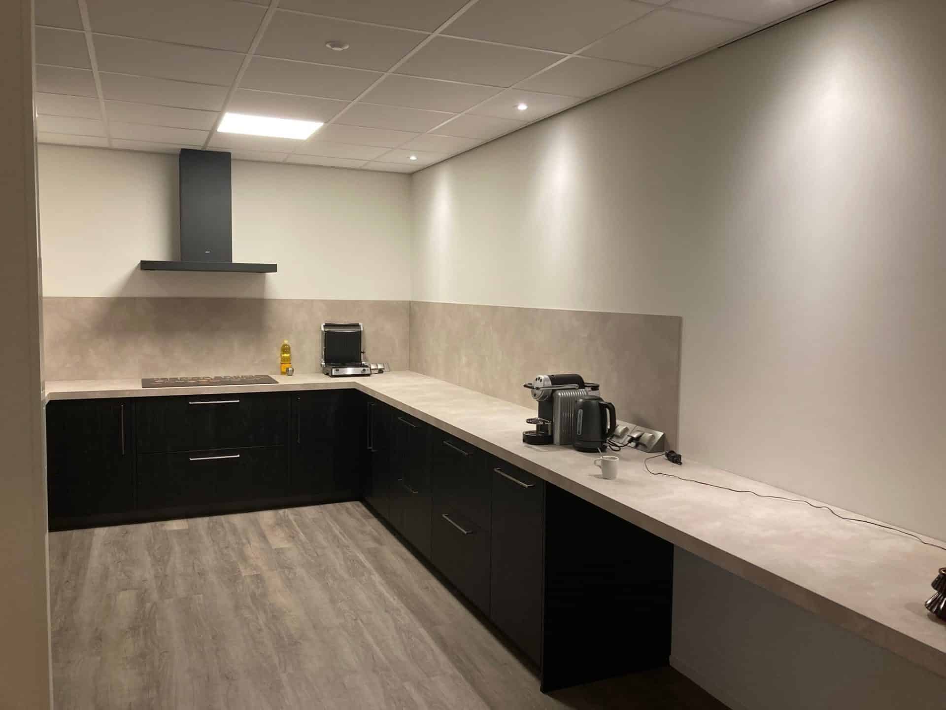 De collega’s bezochten de showroom van Kitchen at Work om hun plannen verder vorm te geven. “Dat is een aanrader, want je krijgt daar een duidelijk beeld van de mogelijkheden. Het ontwerp voor onze keuken was al gereed voor onze afspraak in de showroom. Dat werkte prettig, want het plan kon steeds met enkele klikken worden aangepast naar andere kleurstellingen. Zo konden we vlot de verschillende knopen doorhakken, wat betreft kleuren, materiaal, definitief ontwerp en apparatuur.” Terwijl in het pand van Intersolve de muur werd verwijderd, was de nieuwe keuken al onderweg. “De levering en de plaatsing van de keuken gingen snel! Ook was het fijn dat de ruimte schoon en netjes werd opgeleverd.”