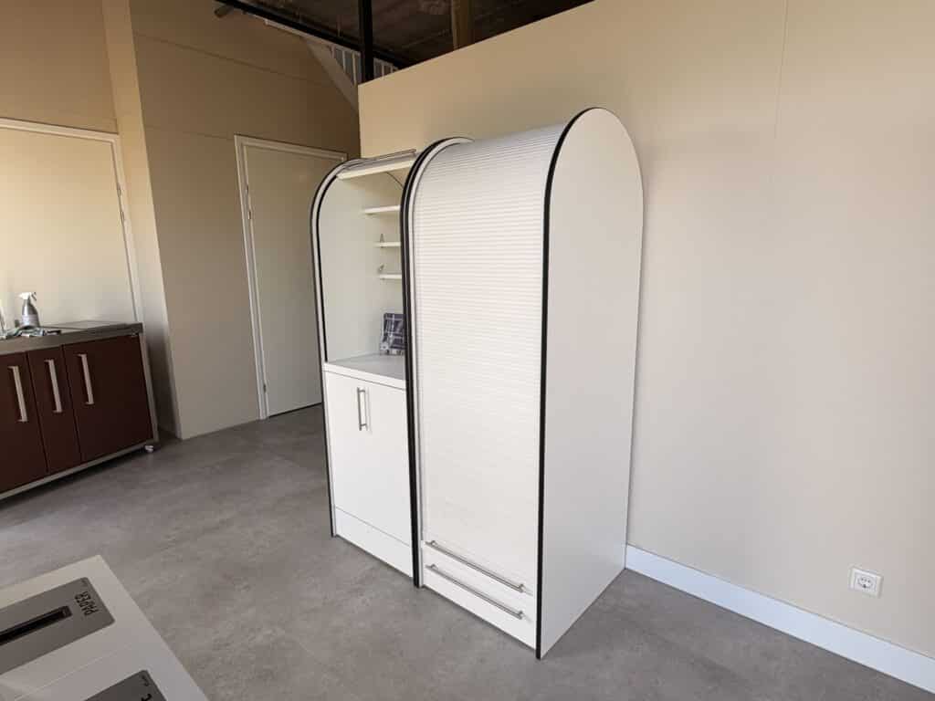 Deze compacte set is uitgevoerd in een witte kleur met een wit HPL werkblad. Het betreft een showroommodel. Het is een bijzetkast bestaande uit een Siemens vaatwasser van 600 mm breed en een extra bijzetkast met legplanken en een roljaloezie. Onderin zit nog een extra lade. Een ideale plek om bijvoorbeeld servies en koffie op te bergen (uit het zicht). Zeer geschikt als compacte oplossing voor bijvoorbeeld kantoor, winkel of showroom.