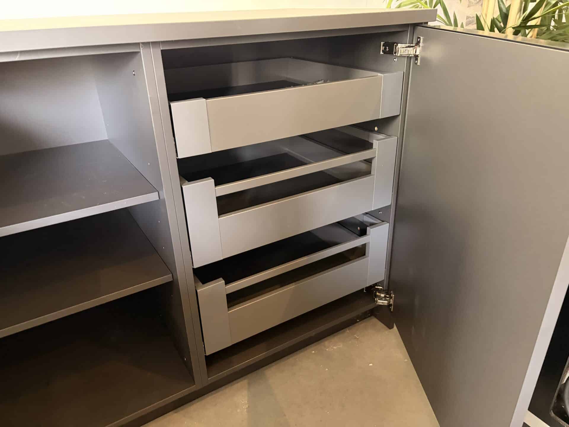 Strak koffiemeubel met zwarte greeplijsten in grafiet ultramat uitvoering. Ideaal voor gebruik als koffiehoek in kantoor, pantry of in een winkel. Voorzien van een werkblad, gesloten kastruimte en een open regaal voor kopjes en accessoires.