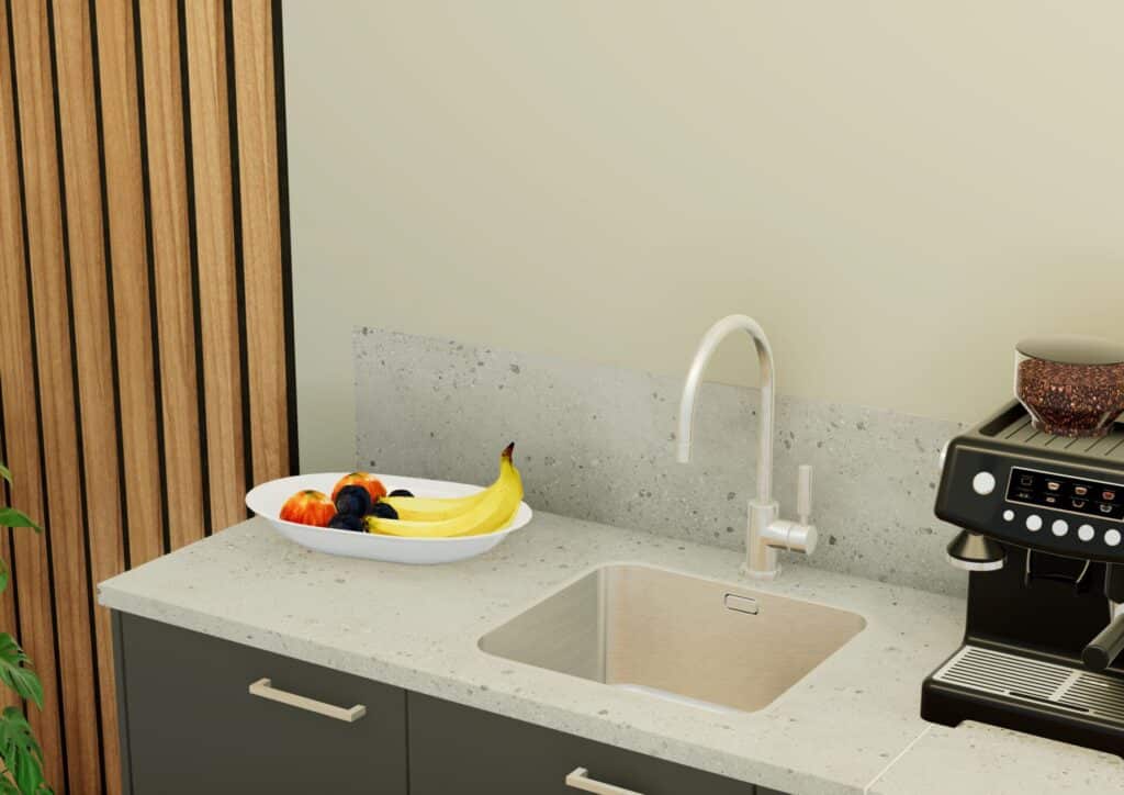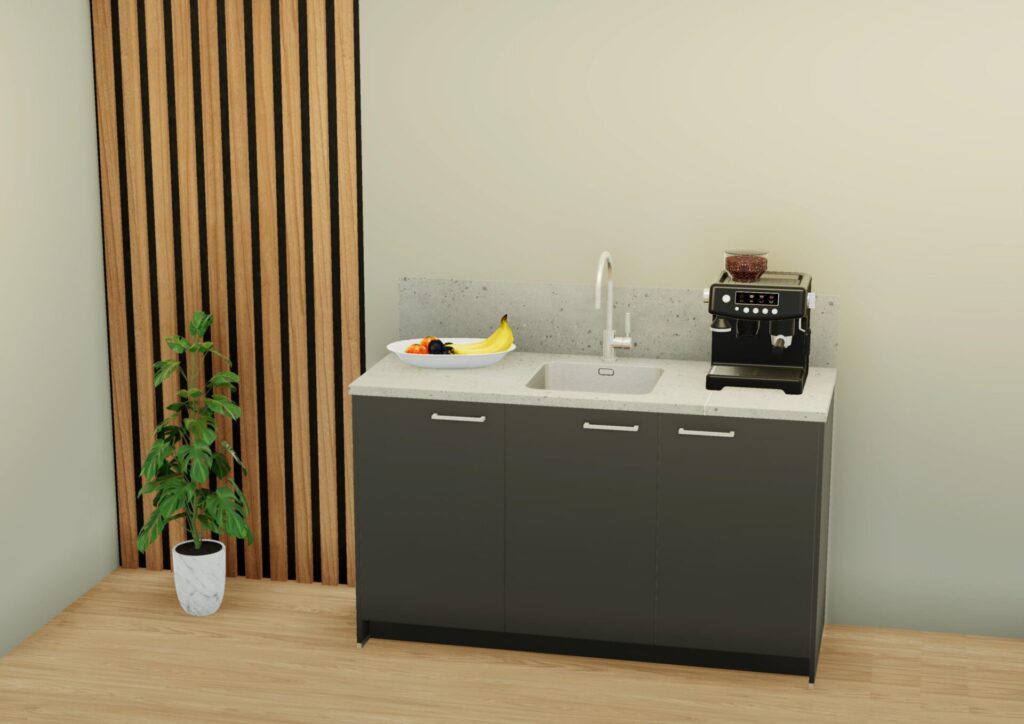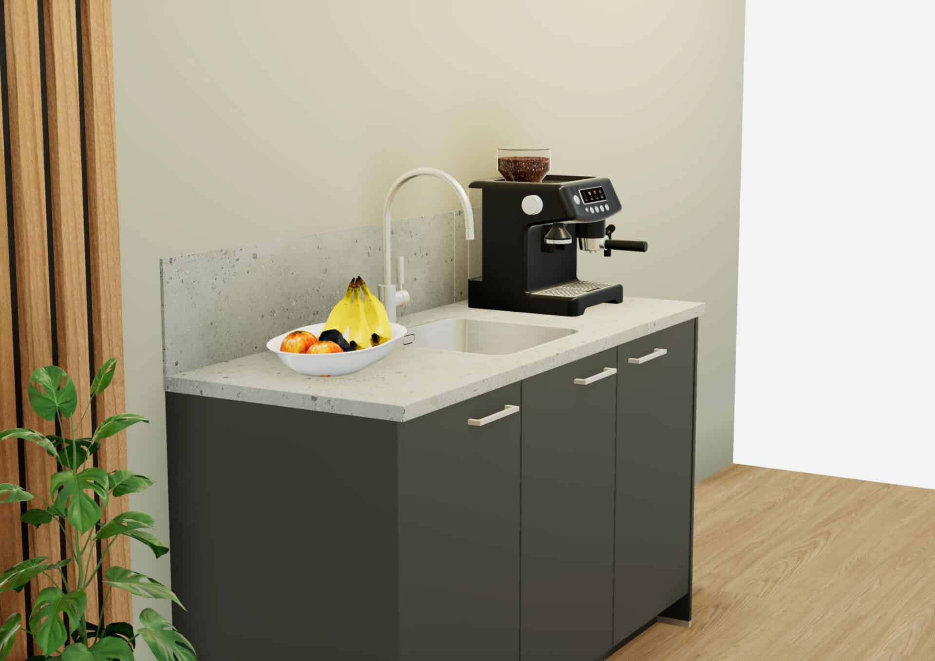 Direct leverbaar wegens annulering: koffiemeubel met een HPL werkblad en spatwand. De fronten zijn gemaakt van melamine in de kleur Vulkaangrijs en voorzien van een rvs-look greep. Het werkblad en de spatwand zijn uitgevoerd in de kleur Sandy Gravel. In het werkblad zit een reeds ingebouwde rvs-spoelbak en een kraangat.