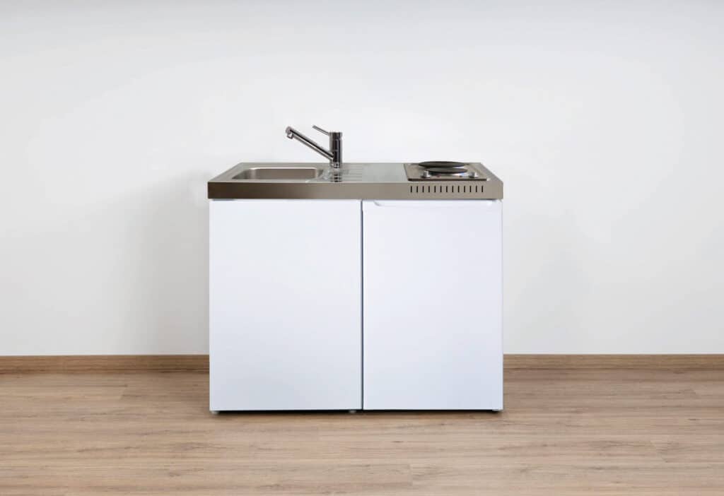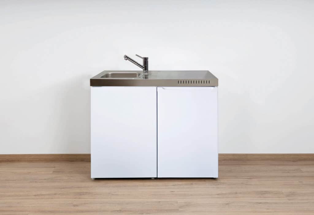 Onze metalen minikeukens bestaan volledig uit metaal en worden kant en klaar (gemonteerd en stekkerklaar) geleverd op een pallet. De E-lijn keukens zijn standaard voorzien van een rvs gepolijst werkblad met een geïntegreerde spoelbak inclusief afdruipgedeelte. Van alle Steel-lijn modellen is dit het instapmodel. Verder zijn de fronten zijn uitgevoerd in gepoedercoat metaal wit met een push-to-open mechanisme. In de keuken zit standaard een koelkast met vriesvak en deurgreep geïntegreerd.
