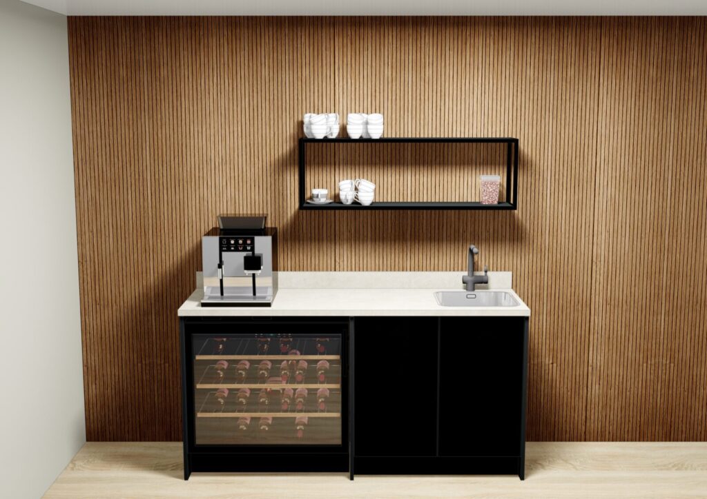 Compact koffiemeubel met vaatwasser, spoelbak, kraan, afvalbak en hoogwaardig werkblad met spatrand