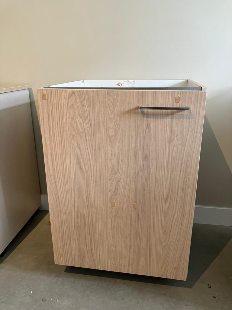 Losse onderkast geschikt als aanrechtkast. Voorzien van een aluminium bodemplaat. Uitgevoerd met een melamine front in de kleur Decor Eiken Como en een korpus in zandkleur. Afgewerkt met een rvs-look greep.