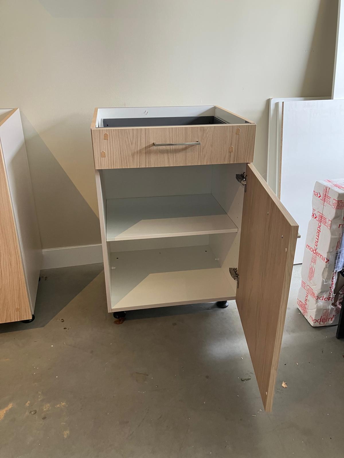 Losse onderkast geschikt voor plaatsing van een kookplaat. Voorzien van een lade en een legplank. Uitgevoerd met een melamine front in de kleur Decor Eiken Como en een korpus in zandkleur. Afgewerkt met een rvs-look greep.