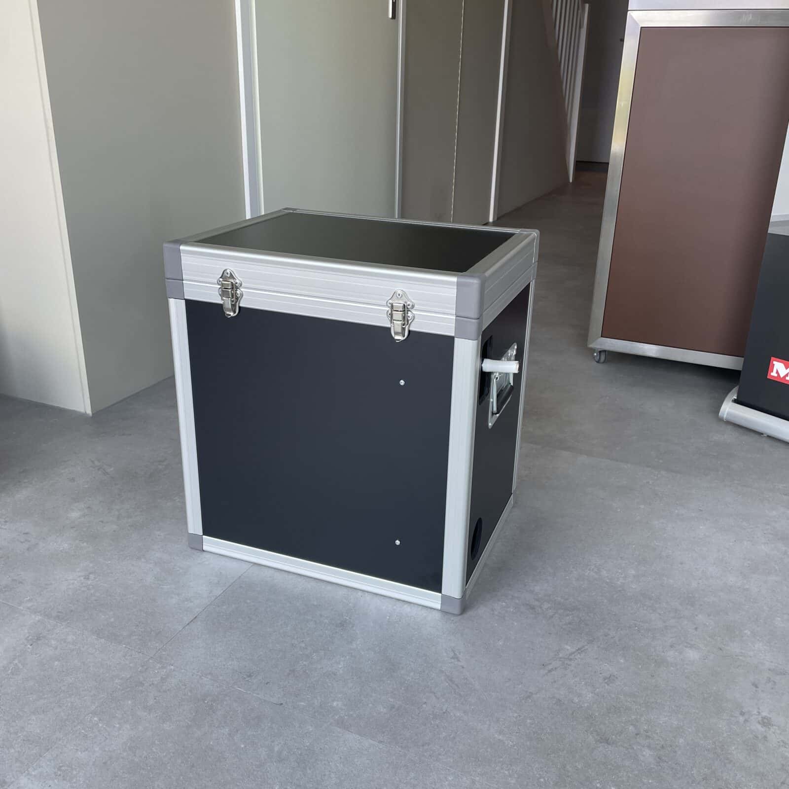 De behuizing is gemaakt van 6,5 mm berkenmultiplex met een zwarte coasting. Aan elke zijde is een aluminium klapgreep geinstalleerd. De deksel heeft 2 openingen met sloten.